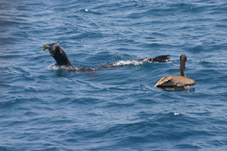 Un lion de mer vient d'attrapper un poisson pour son dîner. Un pélican attend de voir s'il va le lâcher!