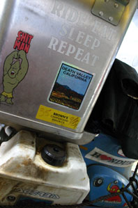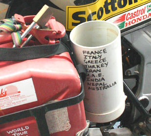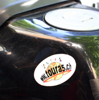 l'Ardèche! Couverte d'autocollants et d'inscriptions marquant les étapes de ses périples déjà réalisés, elle affichait 63'000 km au compteur. Sur ses flancs, deux réservoirs de 10 litres, pour assurer une autonomie quasiment continentale. Sûr qu'elle nous a donné envie de prendre son guidon pour continuer notre tour du monde! Mais à cinq sur deux roues, c'est un peu compliqué... On a laissé un autocollant www.toura5.ch sur un coin du réservoir. Et on a glissé un petit mot sous la visière du casque. En demandant à ce bourlingueur hors du commun de nous contacter. On attend sa réponse pour pouvoir vous en dire plus sur lui. A moins qu'il ne préfère rester à jamais le baroudeur inconnu? Quoi qu'il advienne, bravo à lui.