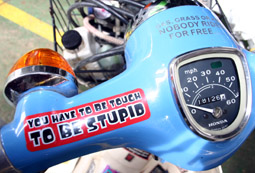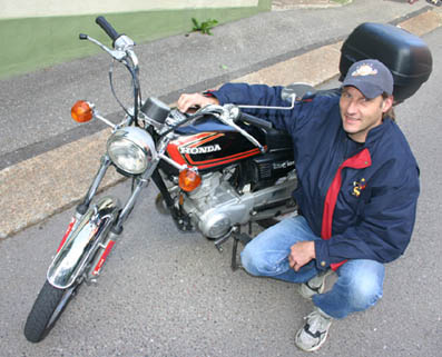 Juillet 2004 / Pas besoin d'aller à l'autre bout du monde pour trouver une Honda bien rétro qui n'en rend pas moins de fidèles services ! Cet été, on a croisé Jean-Claude à La Chaux-de-Fonds sur sa CG 125 de plus de 20 ans. Son épouse la lui a offerte - au prix de 1000 francs! - à son anniversaire. Et il en est drôlement content: "Elle a quelques 20'000 km, et elle marche très bien. A la belle saison, je la roule chaque jour pour aller au travail". Des pannes? "Une seule, récente: j'ai cassé la clé dans le contacteur... Au fait, si Honda peut m'en trouver un nouveau, je suis preneur. Parce que depuis, je démarre en bidouillant les fils!". Appel lancé! En attendant, le premier héros de cette Saga a déjà reçu une casquette "toura5.ch" de chez 100%Swiss. Bonne route!