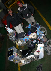 "J'ai déjà parcouru les Etats Unis, l'Amérique centrale et l'Afrique", rigole Dirk. "Moi, j'ai roulé dans toute l'Europe et la Thaïlande, et un peu aux Etats-Unis", lance Sander. Chez ces drôles de globetrotters, "un peu" veut dire plus que plusieurs motards "normaux" réunis! Ils comptent chacun plus de 50'000 km derrière des guidons, toujours des Honda! Pourquoi? "D'abord pour la fiabilité. Et puis, on roule à 75 km/h et on parcourt 55 km avec un litre!". Partis en août 2004, ils sont maintenant au bout de ce marathon. "On va écrire un livre, en espérant qu'il payera notre prochain voyage". Si vous voulez découvrir un bout de leurs aventures, cliquez sur leur site: