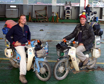 Février 2005 / Cette paire d'as venus des Pays-Bas a fait sensation sur le ferry entre Punta Arenas, tout au sud de la Patagonie, et Puerto Montt. Dirk Taalman (28 ans) et Sander Van Breemen (29 ans) arrivaient tout droit en bas depuis... l'Alaska. Oui, ils ont descendu le globe sur leur Honda Super Cub de 50 cmc! C'est la première fois qu'ils voyagent ensemble, mais ils n'en sont pas à l'eur coup d'essai.