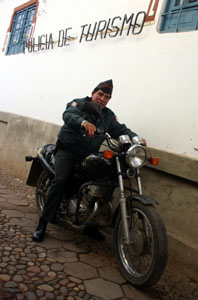 Mars 2005 / Au Pérou, ils ont une Policia de Turismo. Et devant le poste de Cusco, au No 100 de la Calle Tadapata, nous sommes tombés en arrêt devant la vénérable 250 cc du sergent German Delgado Zarate. Qui n'a mis qu'une condition pour poser sur sa machine: "Quand vous serez rentrés chez vous, vous m'envoyez la photo, d'accord?". Sa Honda noir affiche un étrange kilométrage au compteur, alors que celle de son collègue a le sien arraché. "Elles ont quinze ans, mais elles roulent très bien quand même", précise le policier touristique. Etat des routes oblige, certains de ses collègues roulent des 125 enduro! Comment sa Honda? "Buena"!