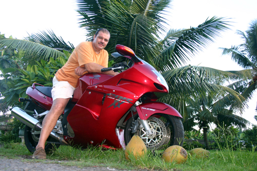 Décembre 2004 / Robert Moulin aime la moto. Et ce n'est pas parce que ce cuisinier neuchâtelois s'est installé et travaille depuis depuis 26 ans à Papara, juste à côté de Papeete, qu'il allait brider sa passion! En 2001, il a craqué pour l'une des plus belles bêtes du marché. L'homme a la carrure de l'emploi et avec un nom de famille comme le sien, il faut un beau moulin comme celui de la CBR 1100 XX Super Blackbird! "Elle est si belle qu'elle est presque un objet d'art", sourit celui qui a suivi toute la carrière de Jacques Cornu. "J'ai gardé quelques contacts avec son mécano Denis Flühman". S'il a peu l'occasion de rouler sa machine, il la bichonne et elle est toujours étincelante. Des virées? "On attrape vite le tournis à enchaîner les tours de l'île", rigole ce Tahitien d'adoption, marié à