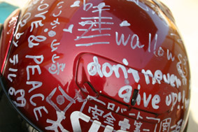 emporté un souvenir douillet: la peau de mouton qu'il a posé sur sa selle. "Car j'avais trop mal aux fesses!". L'idée de ce voyage en deux-roues? "Elle m'est venue car j'étais fatigué des voyages sac au dos. Mes proches ont d'abord réagi en riant. Mais maintenant que je suis parti et que j'approche de l'Amérique centrale, plus personne ne se moque de moi. Ils sont plutôt surpris. Et après, je pense que je rencontrerai surtout du respect". En plus, Saito ne pense pas en rester là: "J'espère un jour faire un même voyage de la Chine à l'Europe, mais avec une Honda de plus grosse cylindrée, comme une Transalp ". Chez lui à Yokohama, c'est une 750 Shadow qui l'attend. Et sa fiancée. Qui lui a écrit un petit mot sur son casque. Bonne route!