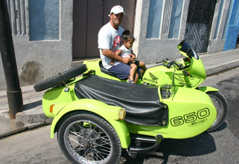Juin 2005 / Incroyable, un side-car Honda! Mais à Cuba, avec les problèmes de transports, il faut être prudent en matière de véhicules... On peut y voir de vieilles américaines actionnées par des moteurs de machine agricole. D'ailleurs, on a vite déchanté. Pas à cause du colori vert kawasaki. Mais son propriétaire a vite confirmé nos doutes en expliquant que sa machine n'avait rien de japonais... "Il s'agit d'un engin soviétique". Si Roberto l'a placardé de logo Honda sur les flancs, c'est parce que la marque ailée le fait rêver. "J'espère connaitre un jour le frisson de rouler une Honda vraie de vraie ". Rien que pour cette passion platonique, il méritait de conclure cette saga des Honda autour du monde. Bonne route, amigo!